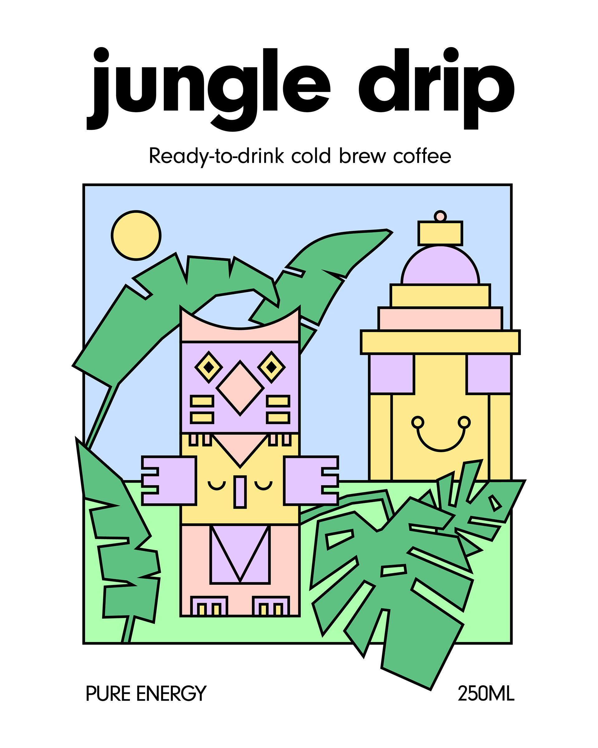For the typography, a strong, clean font was used for "Jungle Drip" that’s highly legible and has a friendly yet confident presence. The supporting text like "Ready-to-drink cold brew coffee" is kept concise and clear, ensuring that the product's essence is immediately understood.